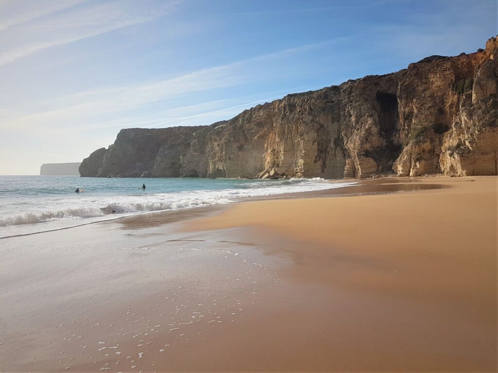 Praia do Beliche beach is the place where boys and girls with surfboards gather. There are waves here, but they are not as big as on the west coast at Cape San Vincent. The beach is sandy and surrounded by steep cliffs. You can go down to the beach via concrete stairs, which are very steep, so it definitely doesn’t qualify as inclusive. There is a small cafe with drinks in the left corner of the beach, and surfers often hang out in the left part.