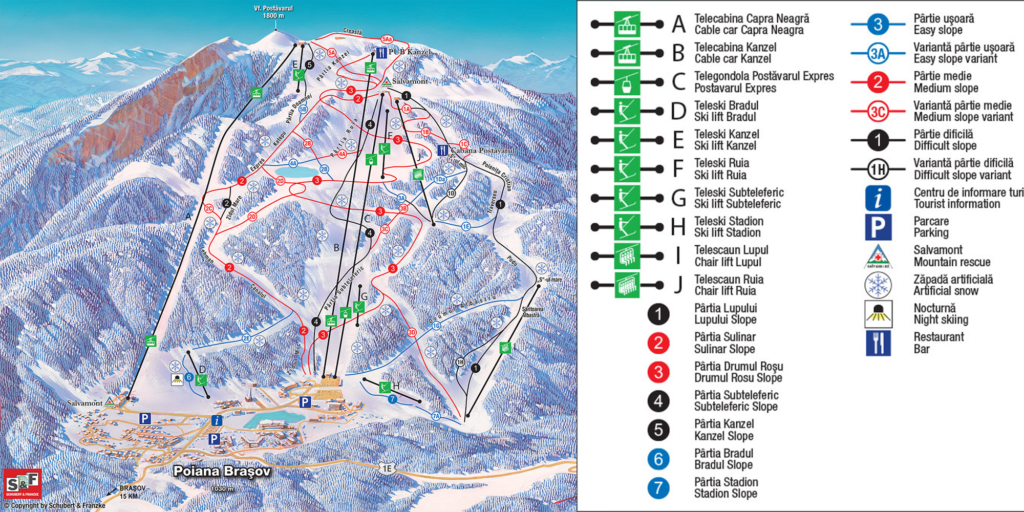 Romania is a mountainous country with several ski resorts—Poiana Brașov, Sinaia, Predeal, or Harghita Bai. Among them, Poiana Brașov is the largest and most famous resort, located 13 km from the city of Brașov, at the foot of Mount Postăvarul.