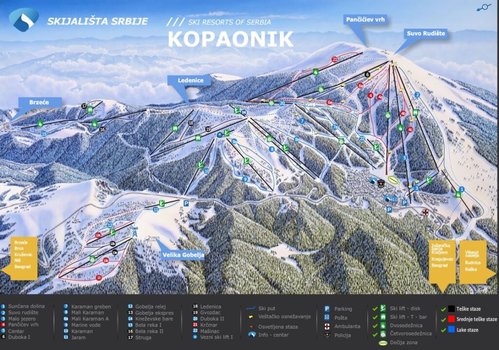 Nearest airports: you can get to Belgrade with Austrian Airlines flights via Vienna. The cost of transporting a set of skis or snowboard with Austrian Airlines is €160 round trip. But there are often free carriage promotions—watch for updates. From Belgrade to Kopaonik—220 km; you can get there by bus.