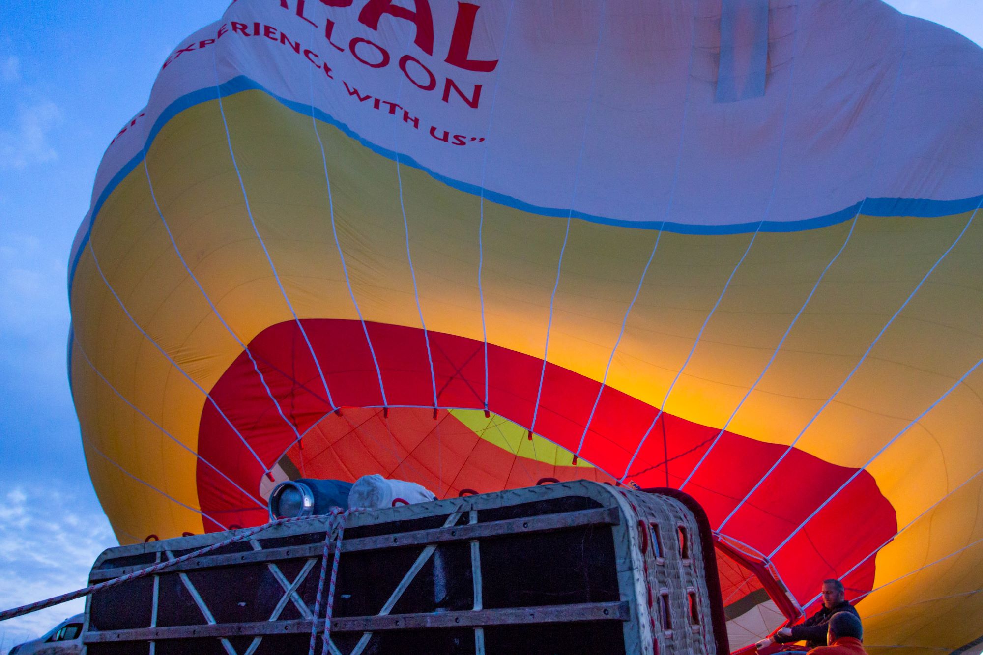 Then everyone gets back into the same minibuses and goes to the balloon launch sites (balloons are raised from different points in the Göreme Valley). First, everyone waits for the balloon to fill with hot air from the gas burner. As the balloon gradually rises, everyone is loaded into the gondolas and the balloon gradually lifts off the ground.
