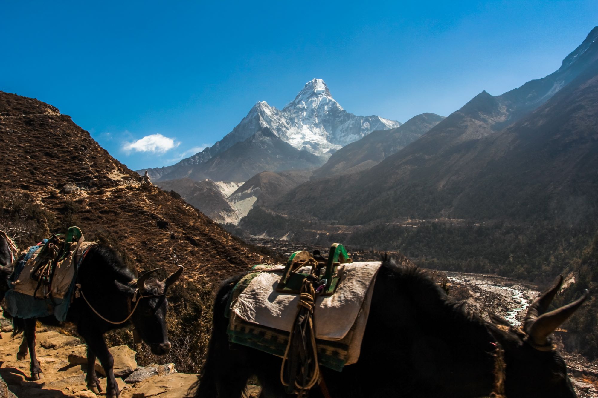 The trek will bring you countless breathtaking views not only of Everest but also of other majestic peaks. You will also see firsthand the harsh life of local Sherpas, for whom hiking up and down these steep mountains is just everyday life. And monks residing in the Tengboche Monastery, which is located at 3800 meters. You’ll meet herds of shaggy yaks carrying loads – there are no roads in Sagarmatha region, so everything is carried by Sherpas or these high-altitude animals.