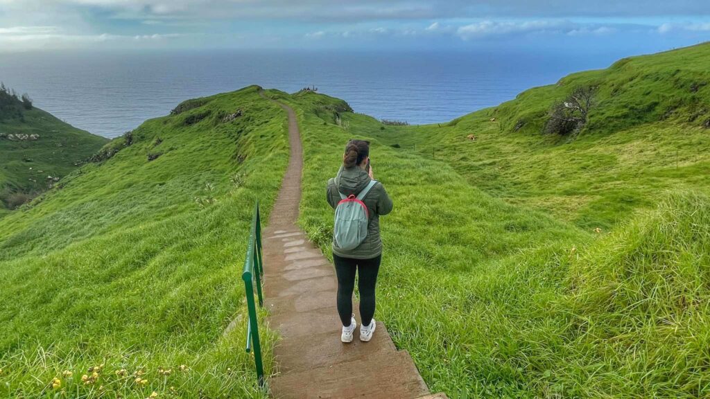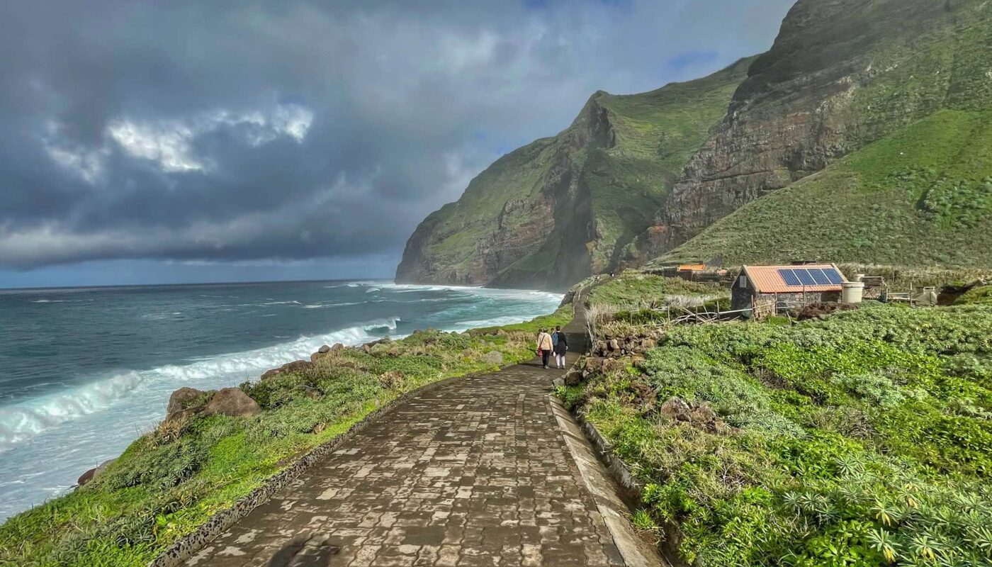 Next, we headed to a truly atmospheric and remote location that can only be reached by cable car – Achadas da Cruz. This hidden gem on the oceanfront feels like a lost world. Here, you’ll find small agricultural plots, tiny holiday cottages belonging to local residents, and a beautiful stone path that runs along the coastline and massive cliffs.