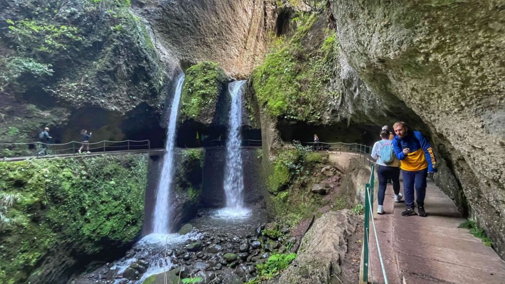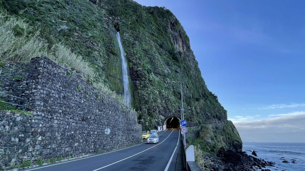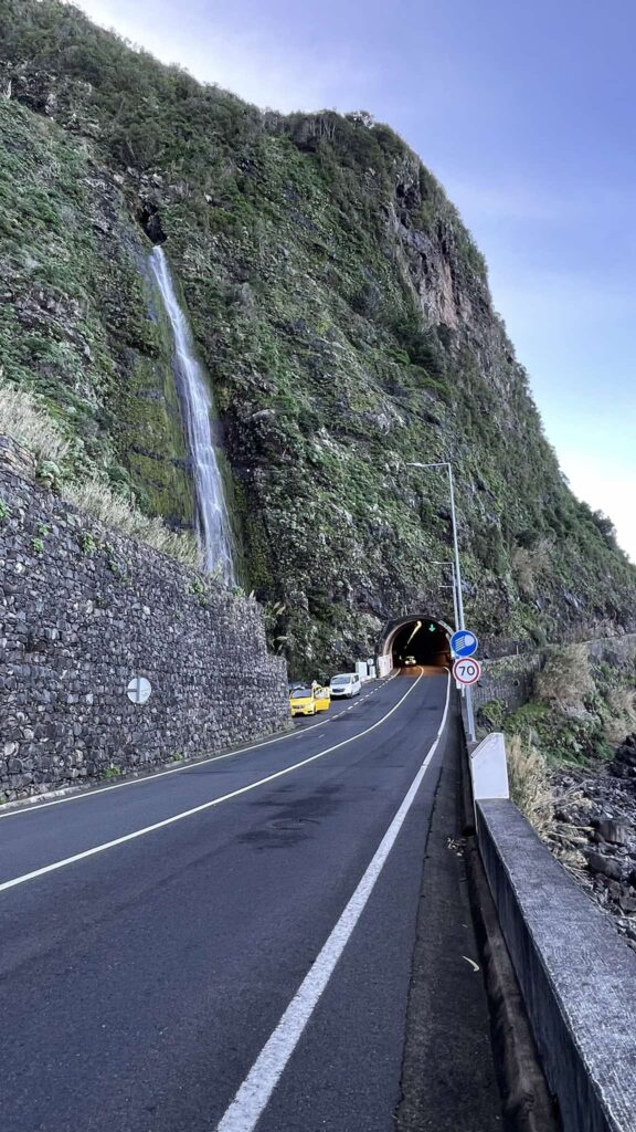 Next on our journey was one of Madeira’s most unique sights—the Angels’ Waterfall (Cascata dos Anjos), which cascades down a cliff directly onto the road. Unfortunately, in 2025, the ER101 road is closed to traffic due to landslides. However, you can park nearby and walk just 100 meters to reach the waterfall.
