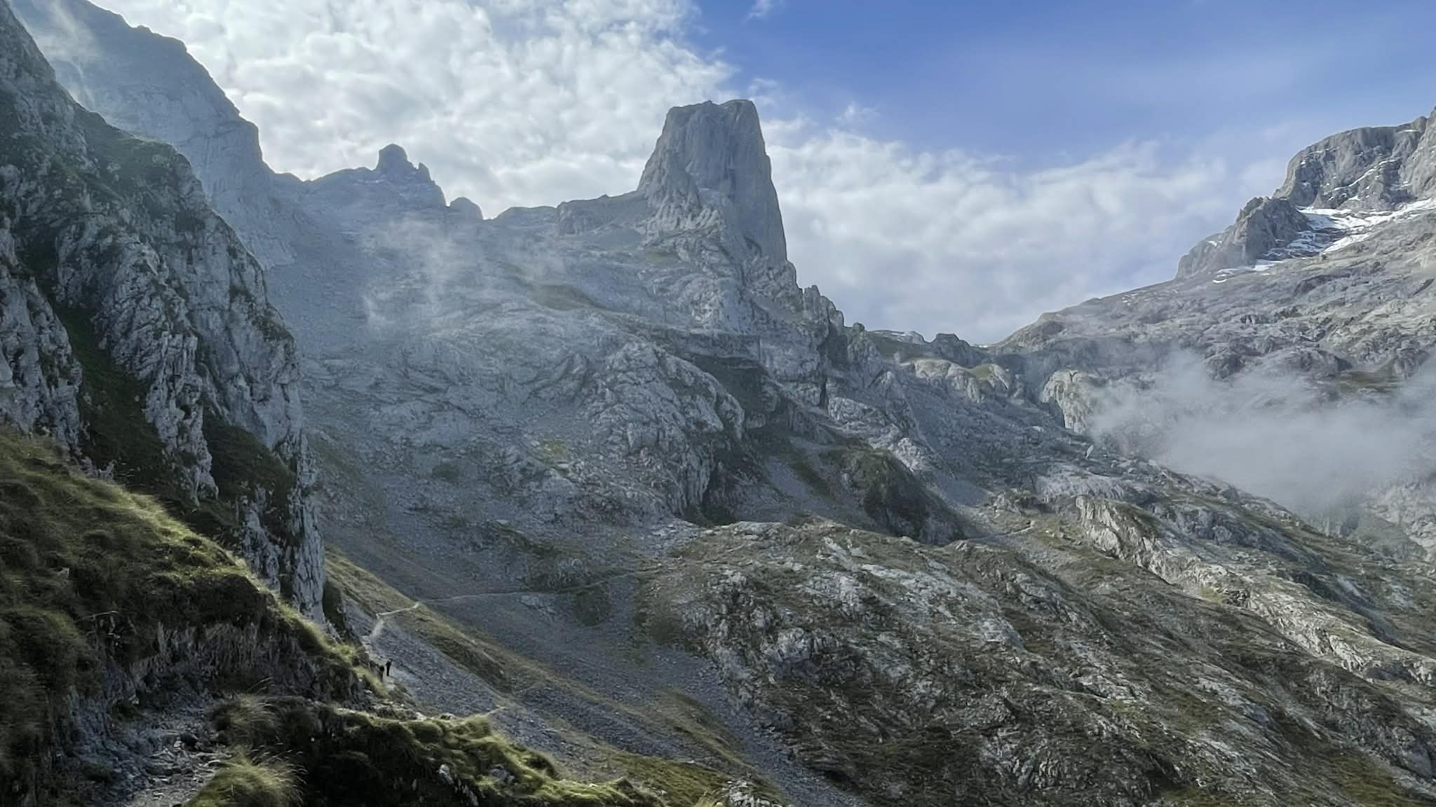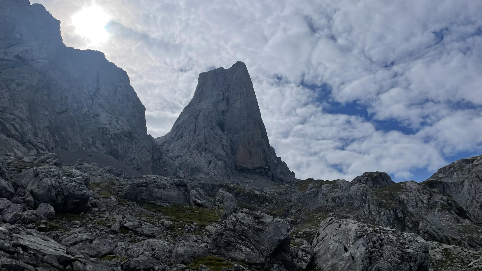 The higher I climbed, the harder it got with my 8-kg backpack. My breakfast energy had faded and clouds were gradually rolling into the mountains. After about three hours of climbing, I rounded a rock and saw it—Picu Urriellu, floating on clouds. Happy tears came to my eyes—I was seeing this beauty with my own eyes.