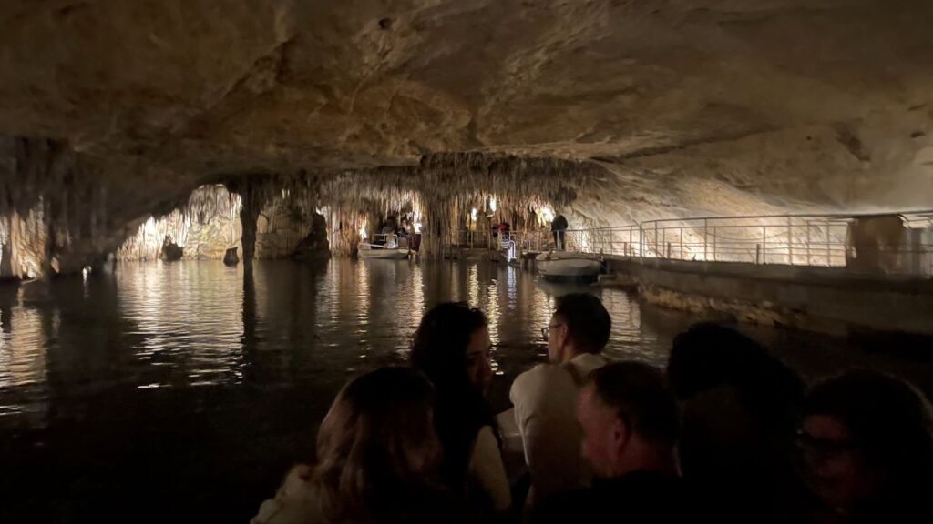 Всередині — чотири великі печери, що простягаються на понад 1,2 км, з фантастичними сталактитами й сталагмітами, підсвіченими теплим світлом. Я була у різних печерах, наприклад, дуже вразили минулого року Печери Нерха – вони неймовірно величезні. Але в цієї печері більше вразили не масштаби, а неймовірна кількість малесеньких сталактитів, які як голочки вкривають всю поверхню стелі. Ну і звісно підземне озеро, по якому плавають човники.