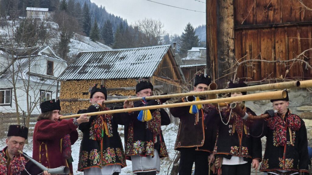 Гуцульська коляда — це давня традиція, яку зберігають століттями. У Криворівні колядники ходять цілими групами від хати до хати з трембітами, дзвіночками, скрипками й іншими атрибутами, щоб благословляти кожен дім і нести святковий дух.