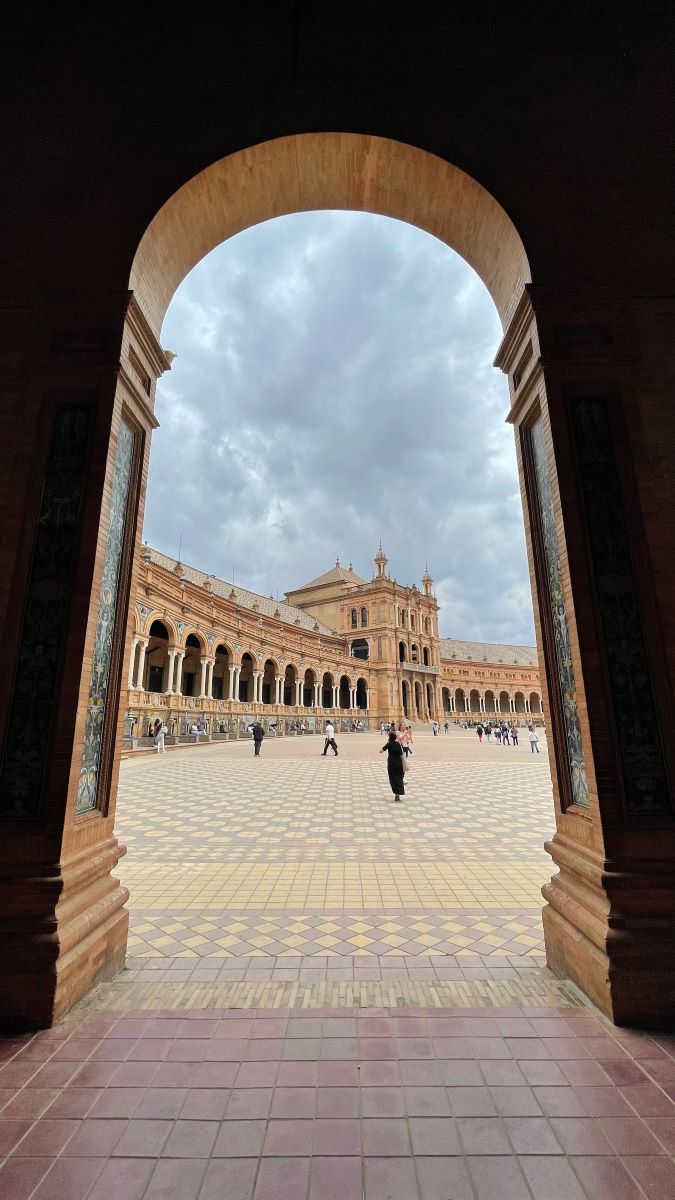 Ми почали вивчення міста з Площі Іспанії. Цю гігантську напівкруглу цегляну споруду з великою площею було спроектовано для Виставки 1929 року. Будівля оформлена 48 порталами, оформленими керамічними плитками, що зображують сцени з усіх провінцій Іспанії.