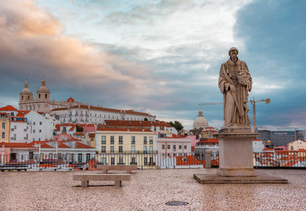 З цієї тераси біля замку можна помилуватися та сфотографувати найпрекрасніший вид на старий Лісабон. Ця середньовічна частина міста більше схожа на середземноморське село чи грецький острів, ніж на столицю. Це та сама Алфама з білими церковними вежами, куполами та різнокольоровими будинками, що падають на пагорб до набережної. В околицях є кілька гарних кафе та ресторанів зі столиками просто неба.